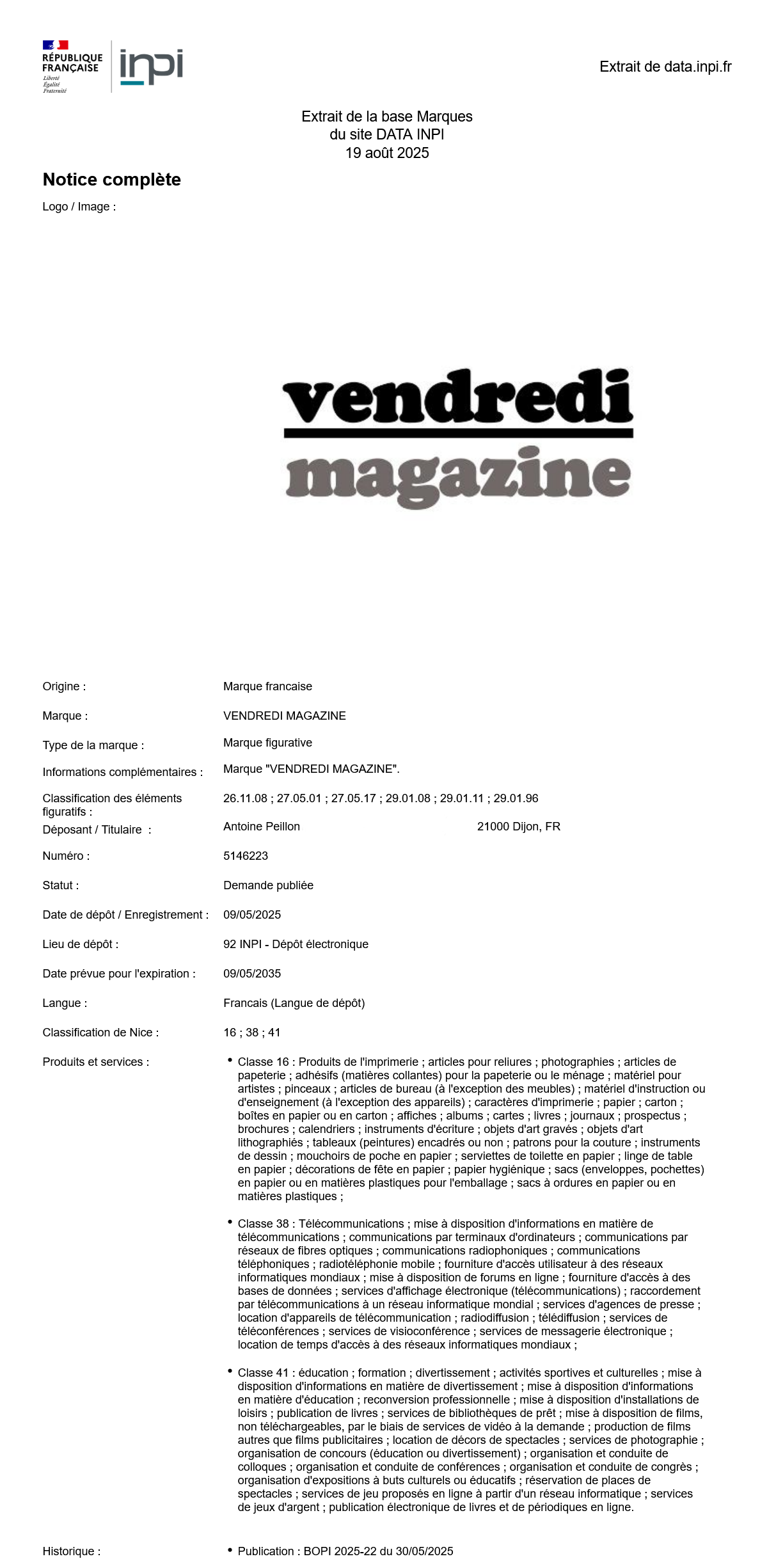 « Vendredi magazine » est une marque déposée à l’INPI pour les classes 16, 38 et 41 de produits et services (n° de la marque : 5146223).
